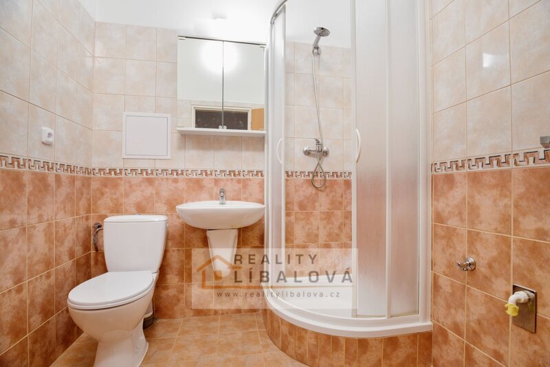 V prostorné koupelně je umístěn sprchový kout.