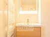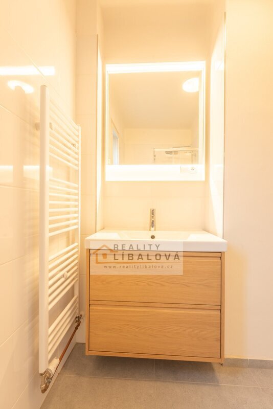 s moderním obkladem a dřevěným dekorem, zrcadlo se zabudovaným