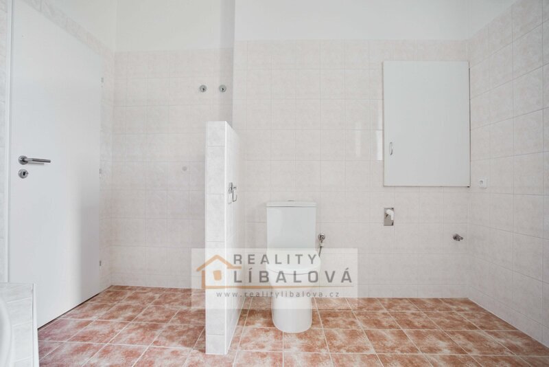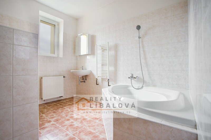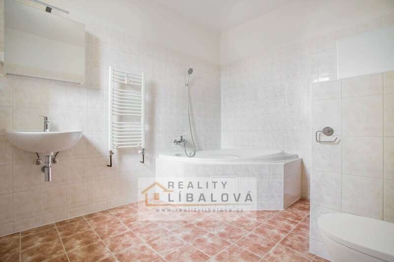 obklady je umístěna rohová vana. Bytová jednotka je velice prostorná a